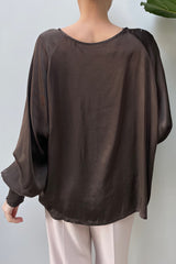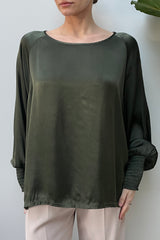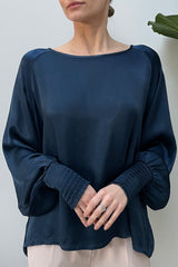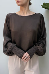 Luxe satin top, has long sleeve and ruched cuff. Crew neck, can be belted, worn loose or tucked in