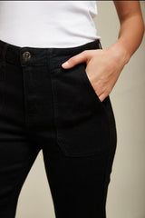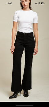 Vintage inspired, high-rise waist jeans in black denim, with wide-leg giving them 70s flared vibes.
