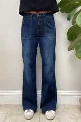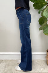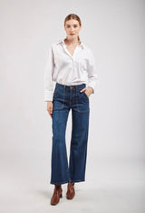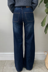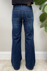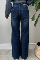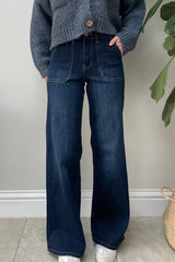 Vintage inspired, high-rise waist jeans in darkest indigo denim wash, with wide-leg giving them 70s flared vibes.