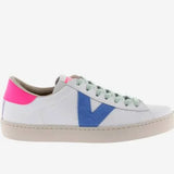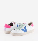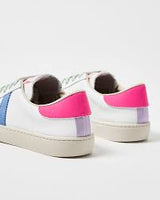 Our exclusive women's white leather trainers are made in Spain and have the LWG (Leather Working Group) silver distinction, which guarantees a responsible tanning process, with an efficient use of water, energy and sustainable waste management. Neon back panel matching the label on the tongue and multi-coloured details on the heel, logo and laces. The light brown sole is made with vegetable oils rather than mineral oils, significantly reducing the environmental impact. These women's white leather trainers also feature a more ergonomic insole, made from recycled materials, ensuring maximum comfort.