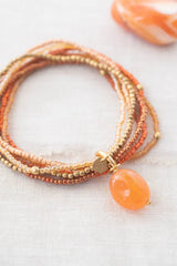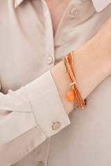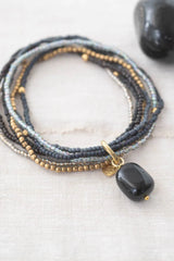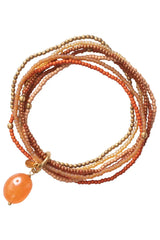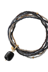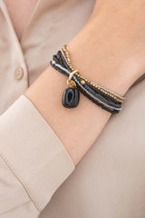 This Nirmala Black Onyx Gold Colored Bracelet by A Beautiful Story consists of seven strands. The strands are made of colored glass beads and gold-plated brass beads, strung on elastic. They are tied together by a handmade, gold-colored ring with a large black onyx gemstone attached. The length of the bracelet is 17 centimeters.