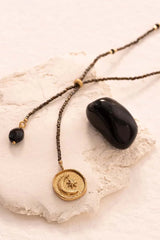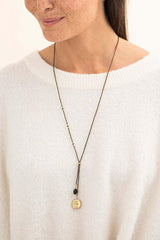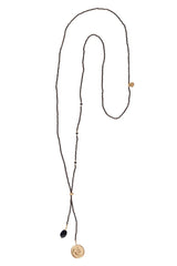 The Purpose Black Onyx Gold Colored Necklace by A Beautiful Story is a beautiful, handmade necklace that is made of glass beads and gold-plated brass and features three small black onyx gemstones. The necklace splits into two ends, giving the necklace a unique look. On one end hangs a large black onyx gemstone pendant and on the other end hangs a gold-plated coin with a moon and star symbol.