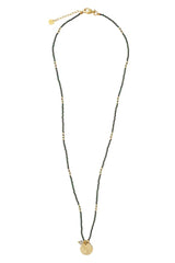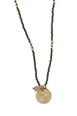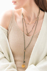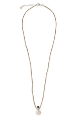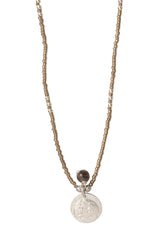 Meet the Timeless Smokey Quartz Silver Colored Necklace by A Beautiful Story. This handmade necklace is made of colored glass beads and brass beads. It features a smokey quartz gemstone and a small silver-plated tree of life charm.