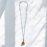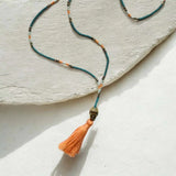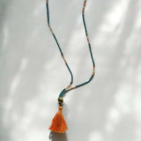 Featuring tiny beads in orange, teal, baby blue and gold finished of with a buddha head bead and orange tassel.