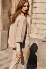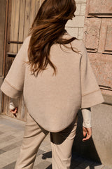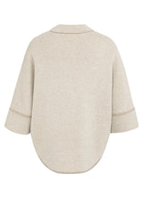 This elegant poncho cardigan is jacquard knitted and features an oversized fit with a rounded hem. The three-quarter sleeves and soft fabric offer a comfortable and stylish look. Finished with a subtle collar and visible seam details for a modern touch. Perfect for layered outfits. The model is 175 cm and wears size 2.