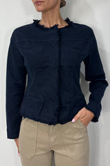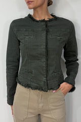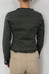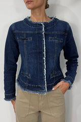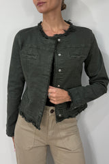 Short length washed denim jacket. Button up front with two side welt pockets and two buttoned flap pockets.