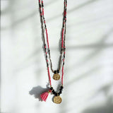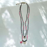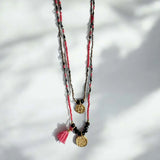 A two-strand necklace made from tiny beads in stunning colours of raspberry, silver grey and black with accents of black. Two small discs finish the look.