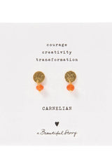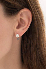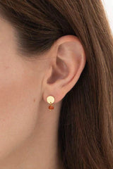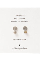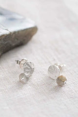 These Mini Coin Labradorite Earrings by A Beautiful Story are small stud earrings with a length of 1.5 centimeters. The handmade studs have a silver-colored coin and a small labradorite gemstone.