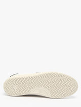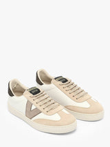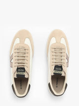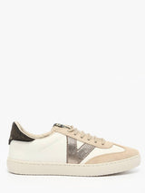 White women's trainers made in Spain from leather-effect material and suede panels. Metallic V detail on the side (in beige) and coloured heel tab. Tone-on-tone round laces and new cyclist-style toe design. Shearling detail on the tongue. Their slightly toasted sole is made with vegetable oils instead of mineral oils, reducing environmental impact. They also feature a more ergonomic insole, made from recycled materials, providing superior comfort with every step.