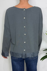 Simple cotton long sleeve top with back button fastening and frayed hem detail