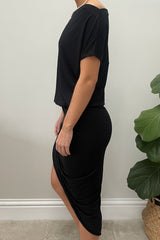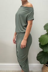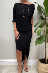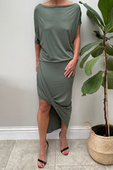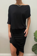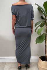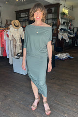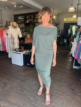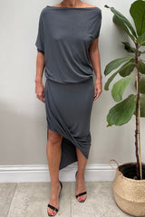 Calli twist jersey dress. Has slash neck elasticated waist with twist detail on one side. Looks great worn off the shoulder.
