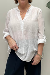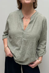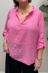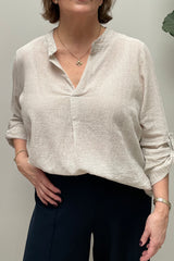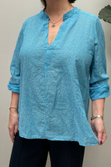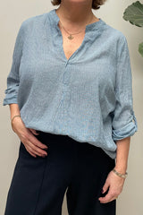 The coolest best-selling crinkle, cotton top. No button 'V' neck, generous cut and longer at back than front. Sleeves can be worn down or buttoned up. Available in pretty summer colours with a light pin stripe running through the gauzy fabric.