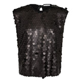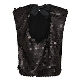 Elegant sleeveless top from Co'Couture with a round neck, small shoulder pads, and a round cutout at the back that ties with a bow at the neck. Regular fit. Measurements for size XS: Chest: 49 cm x 2. Length: 55 cm. Model: Maxicc Sequin Bow Top Blouse 35677 127-Champagne. Material: 100% polyester. Wash at 30 degrees. Color: 127-Champagne.