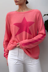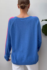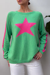 Classic crew neck star sweater with contrast shoulder stripe from cuff to shoulder. One Size - Fits 10 to 14, (Chest 51cm & length 60cm). Made in Italy from 40% Extra Fine Merino, 30% Viscose, 15% Cashmere & Recycled Polyamide.