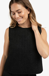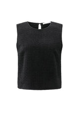 This sleeveless top is crafted from a textured, comfortable fabric with a straight fit. It features a round neckline and an open back with three elegant bow closures, adding a feminine and contemporary touch. Perfect for layering over a blouse or wearing on its own. A stylish piece that elevates any wardrobe. The model is 178 cm and wears size 36.