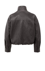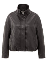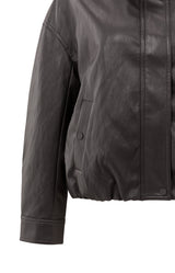 This short jacket is crafted from supple faux leather and features a loose fit with a subtly blouson-style elastic hem. Designed with a stand-up collar, snap button details and a concealed zip closure for a clean look. Finished with welt pockets and cuff buttons. A modern, timeless piece for a refined outfit. The model is 176 cm and wears size 36.