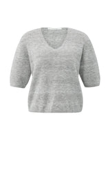 This feminine sweater is made from a soft melange yarn and features short sleeves, a V-neckline and a relaxed fit. The back is detailed with a button row and subtle slit for a playful touch. A perfect layering piece for both casual and refined looks.