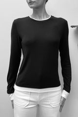 This double layered contrast top is made from soft fabric and features long sleeves, a round neckline, and a fitted fit. Pair it with your favourite jeans for a timeless and stylish look.